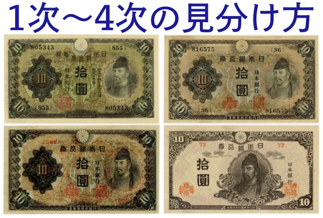 正式名称は『兌換券10円(1次)』、『不換紙幣10円(2次)』、『改正不換紙幣10円(3次)』、『再改正不換紙幣10円(4次)』ですが、この記事では呼び方を『〇次10円』で統一します。